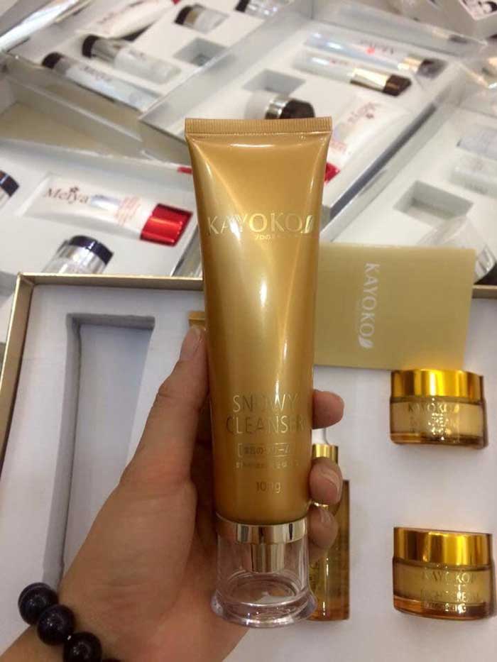 Bộ mỹ phẩm KAYOKO trị nám – Vàng có tốt không? ✿Bộ mỹ phẩm KAYOKO trị nám – Vàng bao gồm 5 sản phẩm chăm sóc da cơ bản và chuyên sâu bao gồm: Kem chống nắng (Sunscreen), Sữa rửa mặt (Cleanser), Tinh chất dưỡng trắng, chống nhăn ( Essence), Kem dưỡng trắng da ban ngày ( Day Cream), Kem dưỡng ban đêm ( Night Cream) ✿ Được biết sửa rửa mặt KAYOKO có thành phần chính là Aqua, Glyxeryn cocoate, glyceryn, dầu cám gạo, tinh chất từ dầu hạnh nhân,… Công dụng chính là giúp làm sạch bụi bẩn, bã nhờn. Làm sạch da một cách dịu nhẹ, phục hồi những vùng da bị hư tổn. Se khít lỗ chân lông hiệu quả, lấy đi các tế bào chết và ngăn ngừa mụn. Cung cấp các dưỡng chất cần thiết cho da, giúp cân bằng độ ẩm.