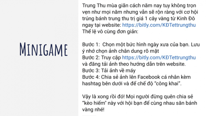 Các chương trình minigame hiện tại thường đòi hỏi khách hàng chia sẻ thông tin về thương hiệu và tặng quà dựa trên yếu tố may rủi hoặc sức ảnh hưởng (bằng các react). Bằng cách này, hoạt động quảng bá sản phẩm sẽ có hiệu quả rõ rệt trong khi thương hiệu vẫn duy trì được ấn tượng “hào phóng” của mình.