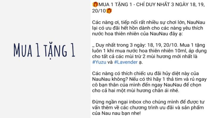 Thông thường trên Facebook sẽ có 02 dạng viết bài về các sản phẩm khuyến mãi đó chính là: (1) Giảm giá xx% nhân dịp nào đó và (2) là mua 1 tặng 1.