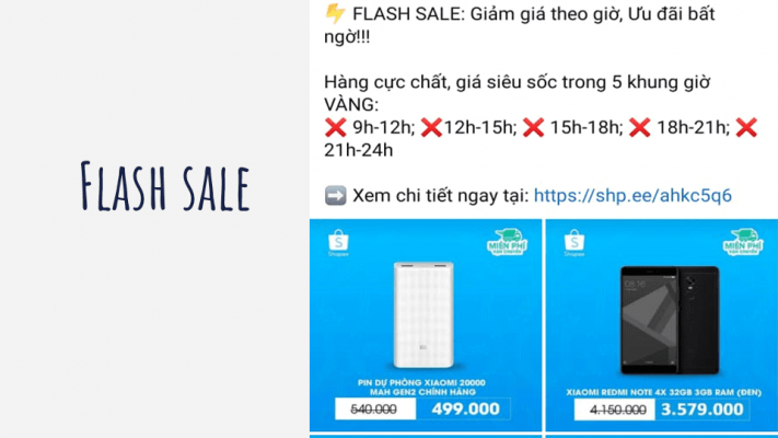 Flash sale (giảm giá chớp nhoáng) tấn công vào cảm giác “sợ bỏ lỡ” của khách hàng bằng cách giới hạn thời gian nhất định và tăng mức hấp dẫn của khuyến mãi. Sự cấp bách và hồi hộp sẽ là những cảm giác kích thích hoạt động mua hàng.