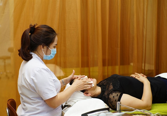 Bác sĩ chăm sóc da cho khách hàng tại khoa Thẩm mỹ Da, Bệnh viện Da liễu TP.HCM