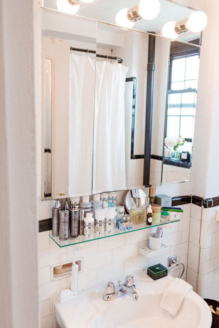 Nhiều cô nàng có thói quen để mỹ phẩm trong nhà tắm để tiện cho việc trang điểm sau khi tắm.
